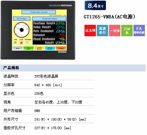GT1265-VNBA | 10.4寸 VGA, TFT256色,交流供电,自带232/422/以太网接口 | 常用 |