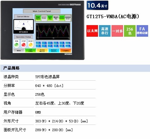 GT1275-VNBA | 10.4寸 VGA, TFT256色,交流供电,自带232/422/以太网接口 | 很常用 |
